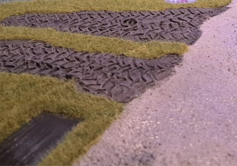 - Als je een harde ondergrond gebruikt kun je het effect van een verzonken weg ook maken door stukjes karton in het midden en aan de zijkanten van de weg te plaatsen en daar de lijm overheen te smeren.